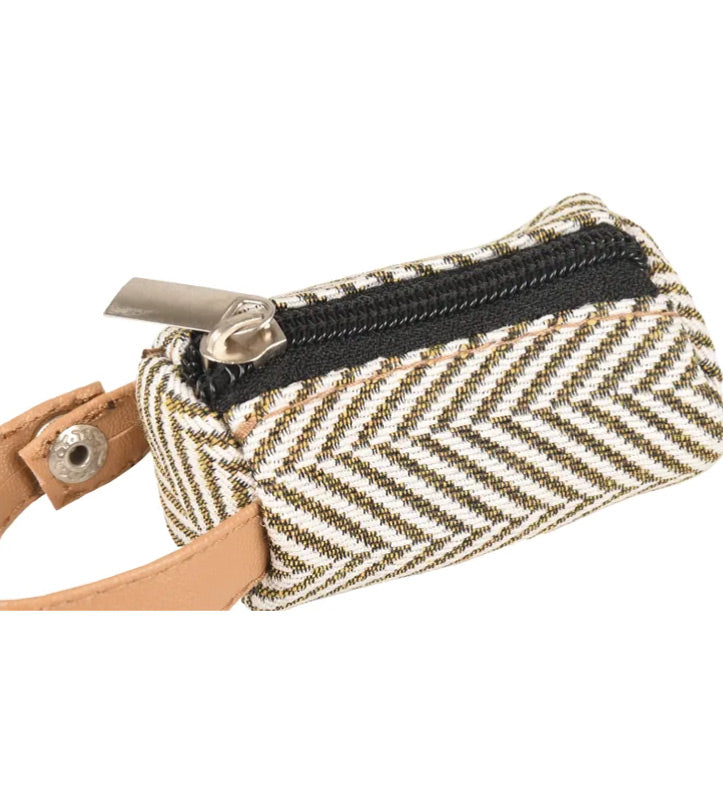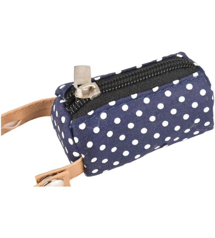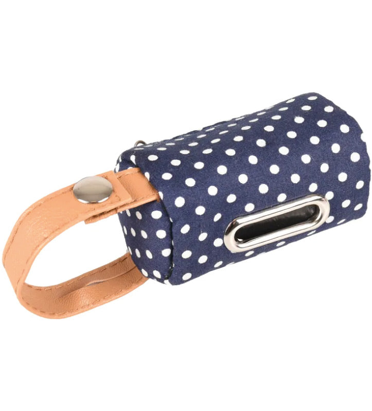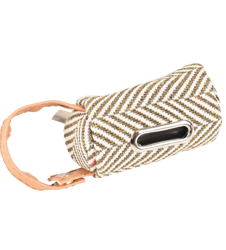 Distributore di sacchetti igienici in cotone con cinghia in cuoio e bottone a pressione per un attacco facile.