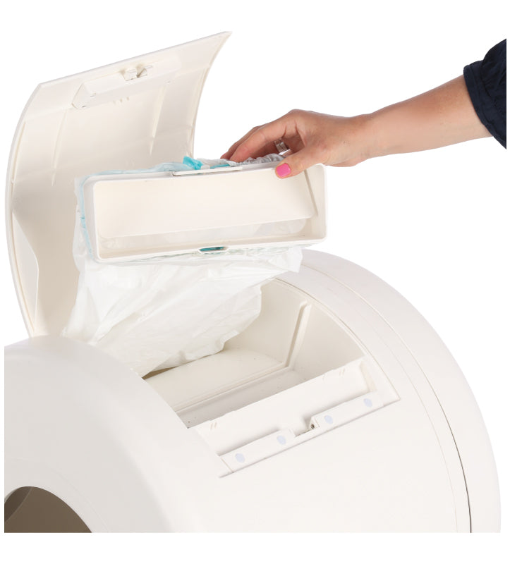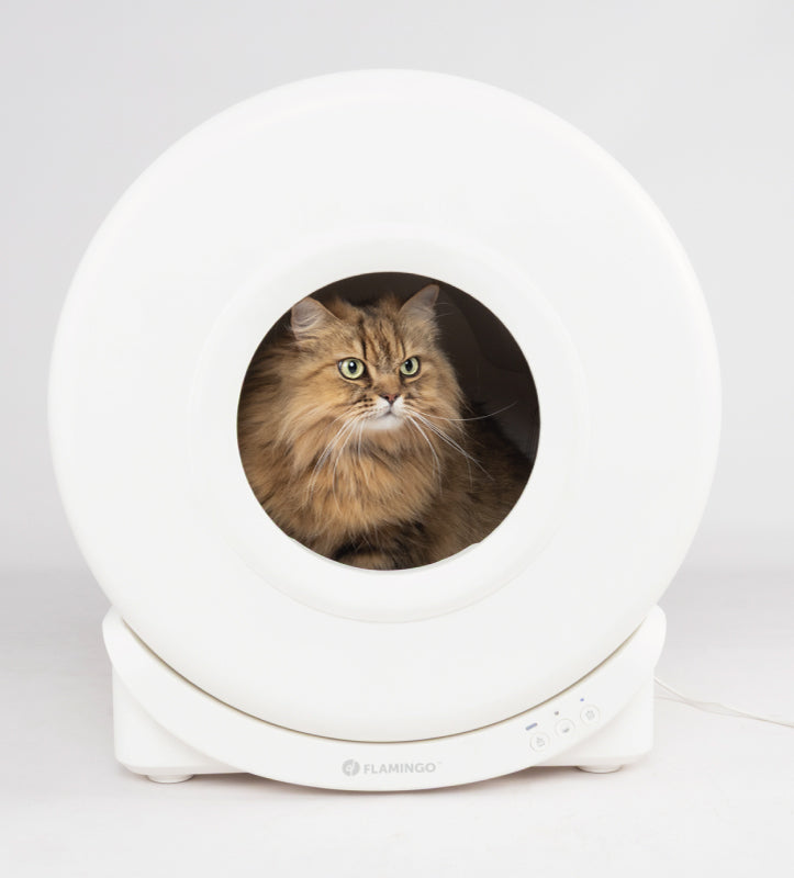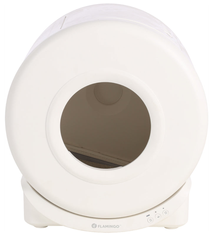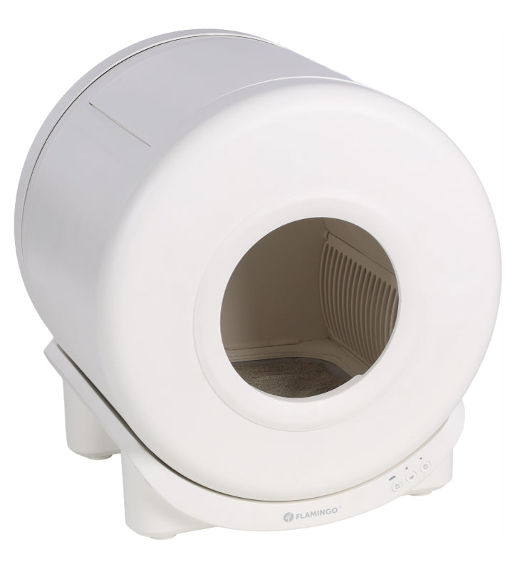 Toilette elettronica autopulente per gatti con un serbatoio da 4 litri per una lettiera agglomerante.