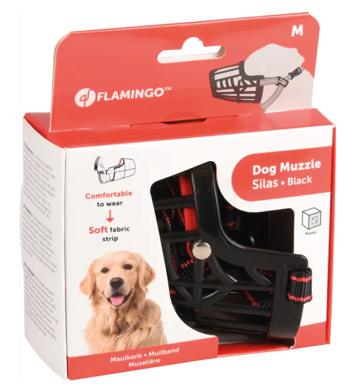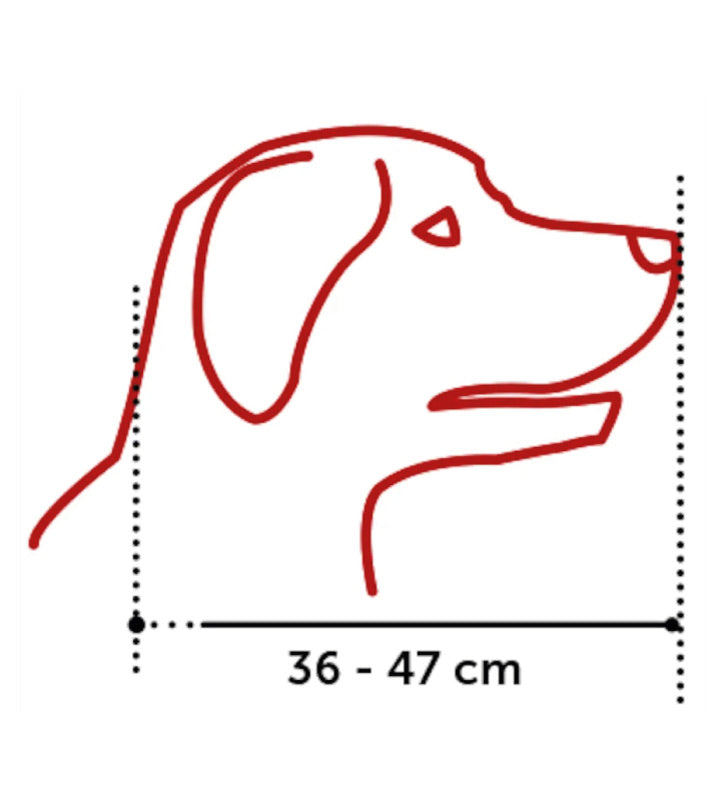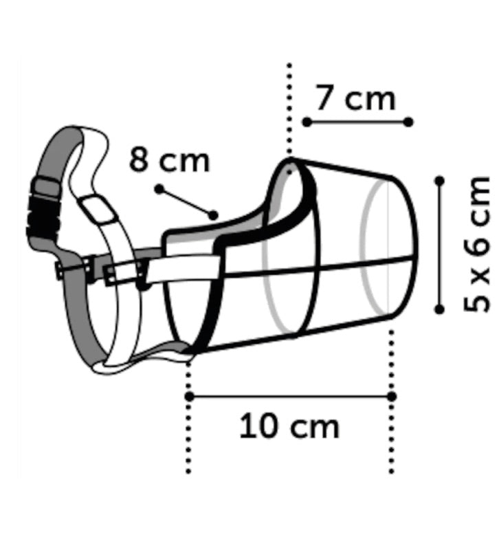 La taglia M misura: larghezza muso 5x6 cm; lunghezza muso 7 cm; lunghezza complessiva 10 cm; circonferenza dietro la testa 34 - 48 cm.