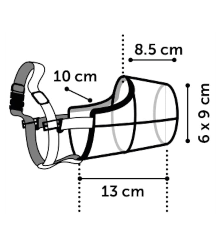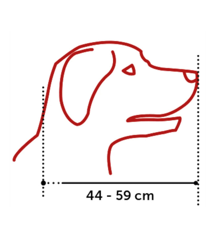 La taglia XL misura: larghezza muso 6x9 cm; lunghezza muso 8.5 cm; lunghezza complessiva 13 cm; circonferenza dietro la testa 45 - 62 cm.