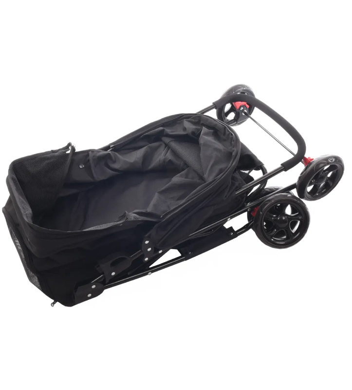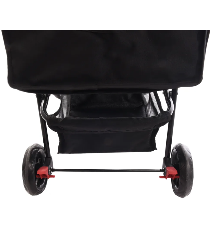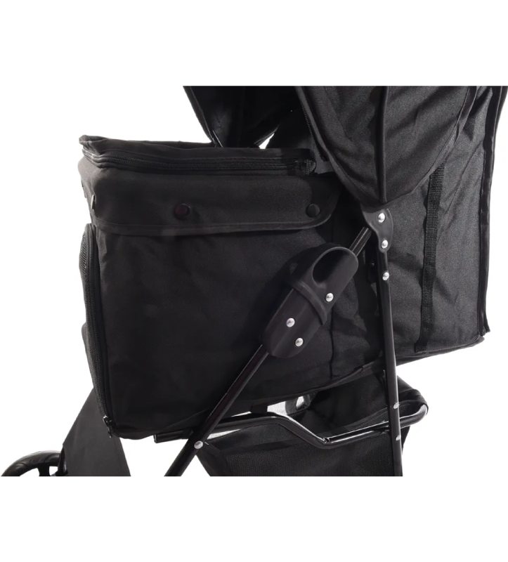 Con cappotta pieghevole. Il passeggino è pieghevole, con doppie ruote anteriori pivotantes e freni di stazionamento (le ruote anteriori possono essere bloccate).