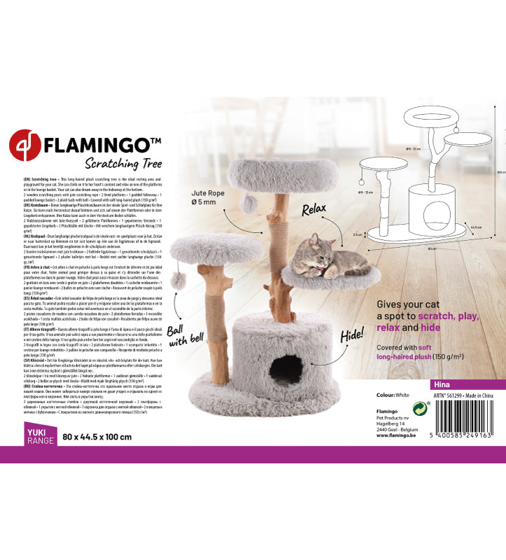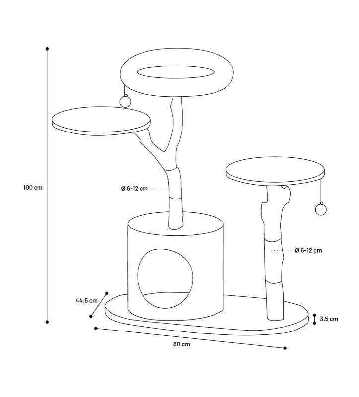 La misura di questo tiragraffi è: area della base con 80x44.5 cm; il tronchetto ha diametro dai 6 ai 12 cm; l'altezza complessiva è di 100 cm.