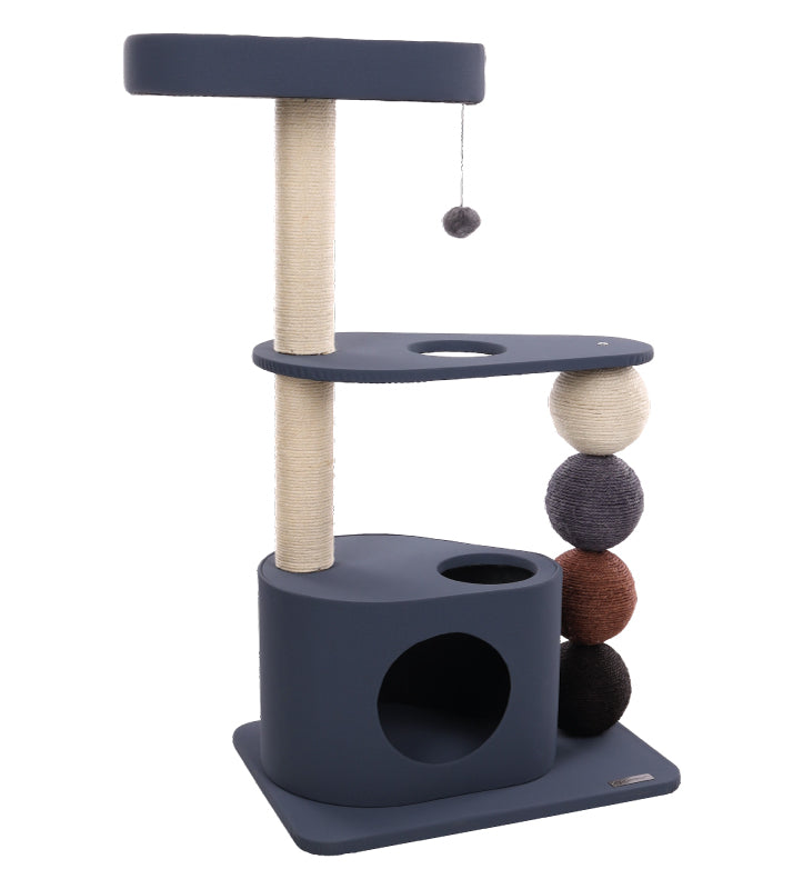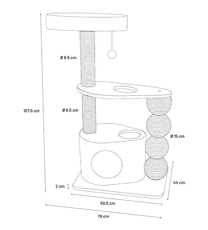 La misura di questo tiragraffi è: area della base con 59.5x44 cm; il tronchetto ha diametro di 8.5 cm; l'altezza complessiva è di 107.5 cm.