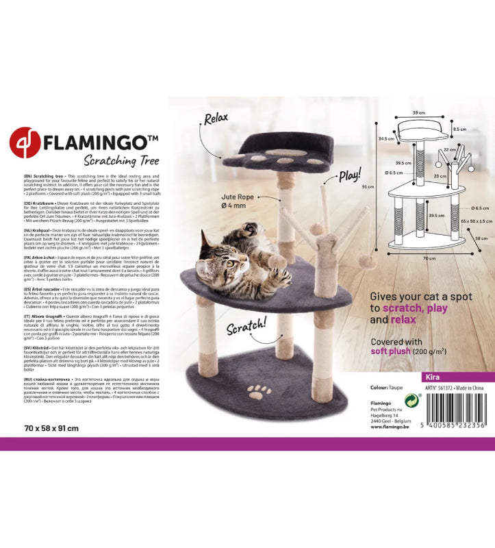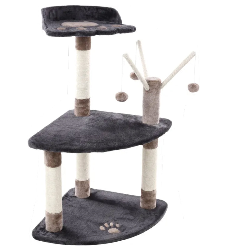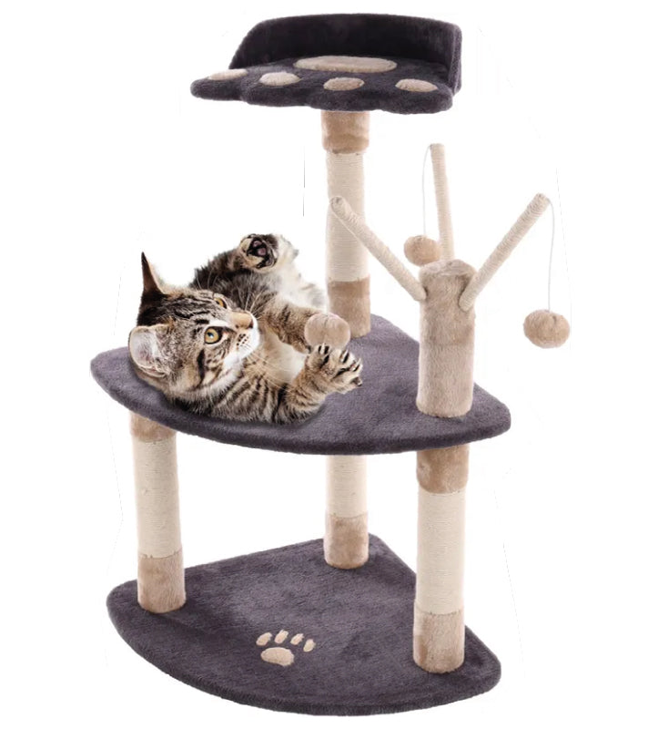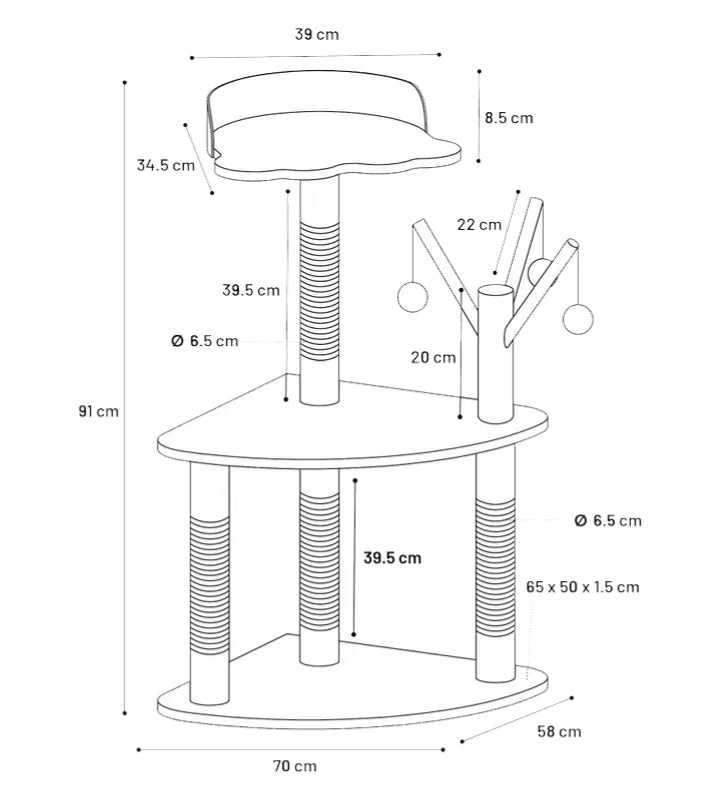 Ha tre piattaforme rivestite in morbido peluche. Ha anche tre giocattoli.
