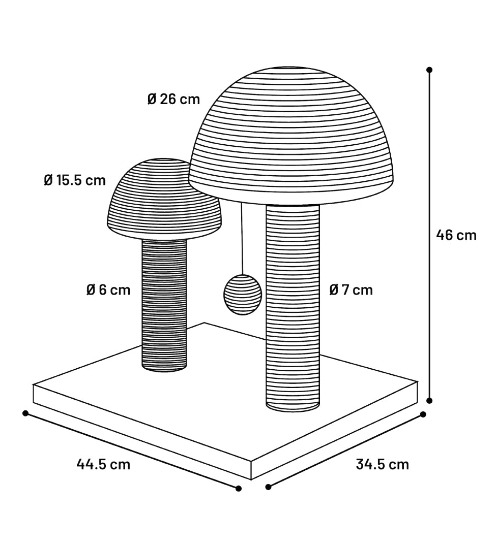 La misura di questo tiragraffi è: area della base con 44.5x34.5 cm; il tronchetto ha diametro di 6 cm quello più basso e 7cm quello più alto; l'altezza complessiva è di 46 cm.