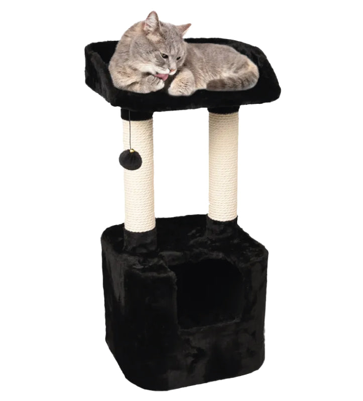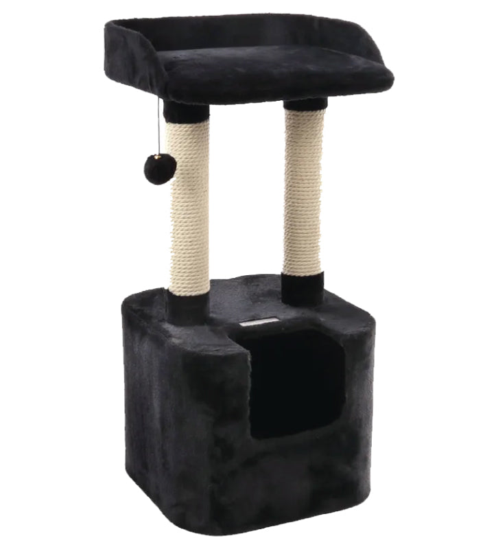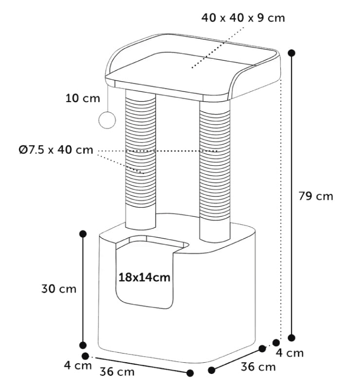La misura di questo tiragraffi è: area della base 36x36 cm; il tronchetto ha diametro di 7.5 cm; l'altezza complessiva è di 79 cm.