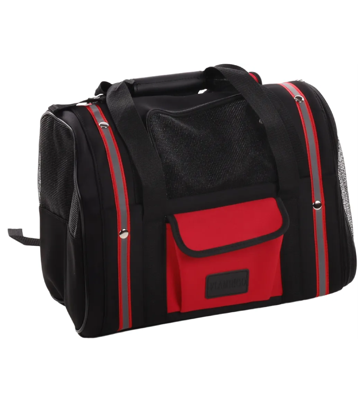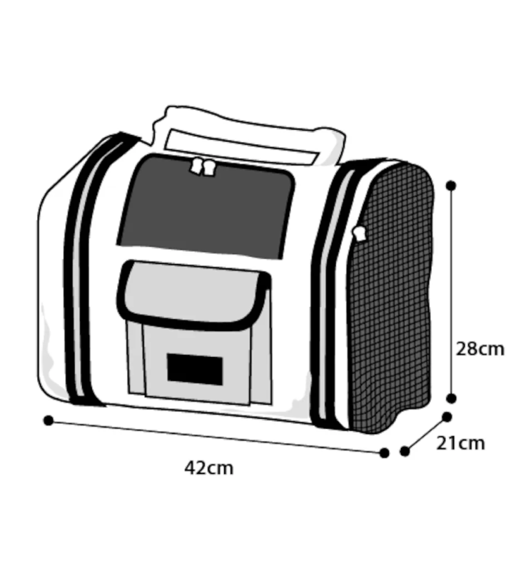 Ha le aperture con cerniera lampo sui lati corti. Può essere aperta la parte superiore per permettere all'animale di mettere la testa fuori.