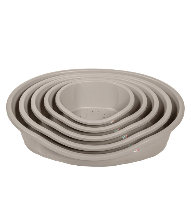 Ha il fondo con fori di areazione e piedini antiscivolo.