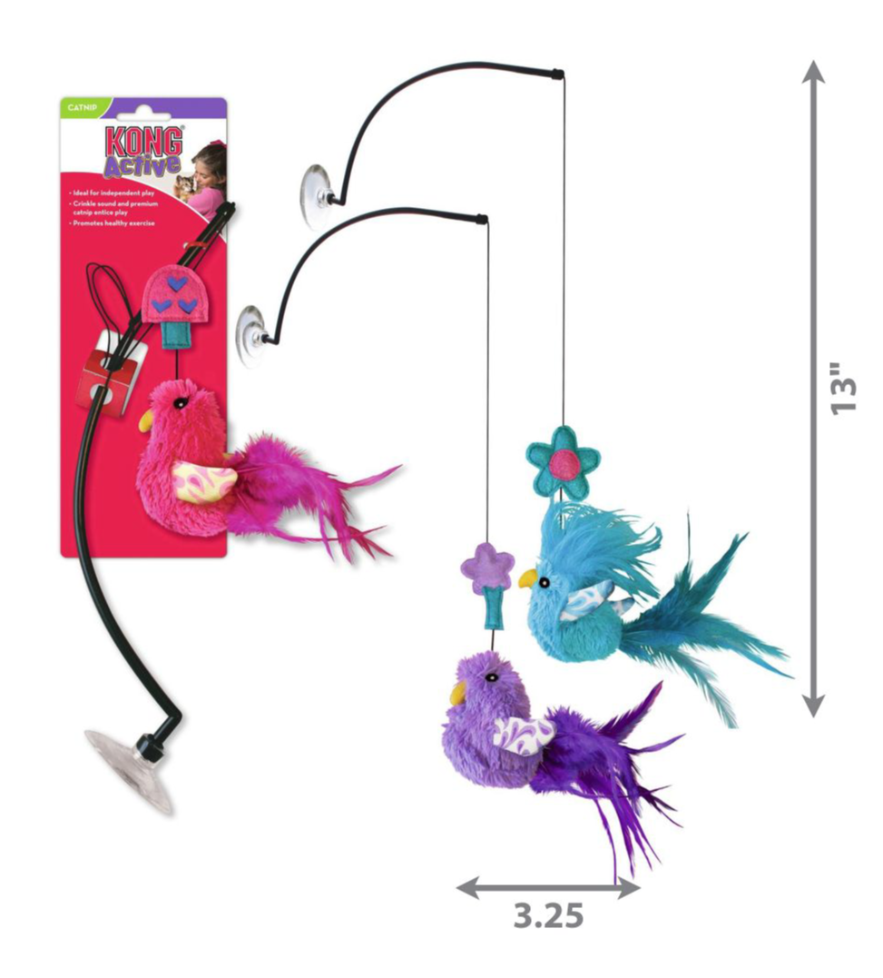 Oltre ad emettere un suono frusciante che stimola ancora di più il gatto, ciascun gioco contiene erba gatta statunitense Kong di qualità elevata e piume colorate.