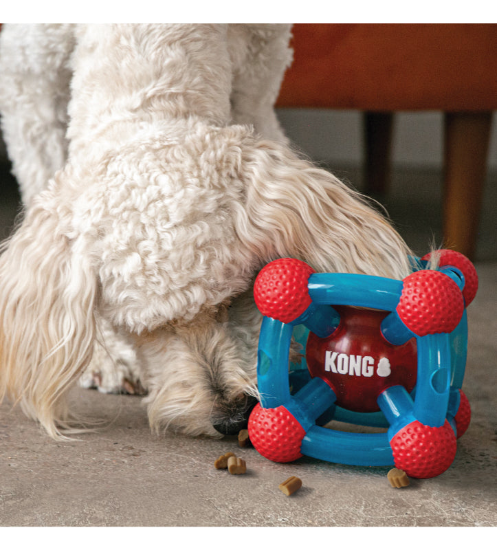 KONG Rewards Tinker dispensa bocconcini in modo casuale attraverso fori in 6 punti diversi, per un irresistibile effetto sorpresa che cattura l'attenzione dei cani. Interagendo col cane, il giocattolo ruota e rimbalza facendo muovere i bocconcini nei tubi. Inserire il cibo è semplice grazie al pratico imbuto, ed ecco uno spuntino che stimola anche il cervello. Usare ai pasti come aiuto per controllare il peso. Angoli silenziosi per un divertimento tranquillo.