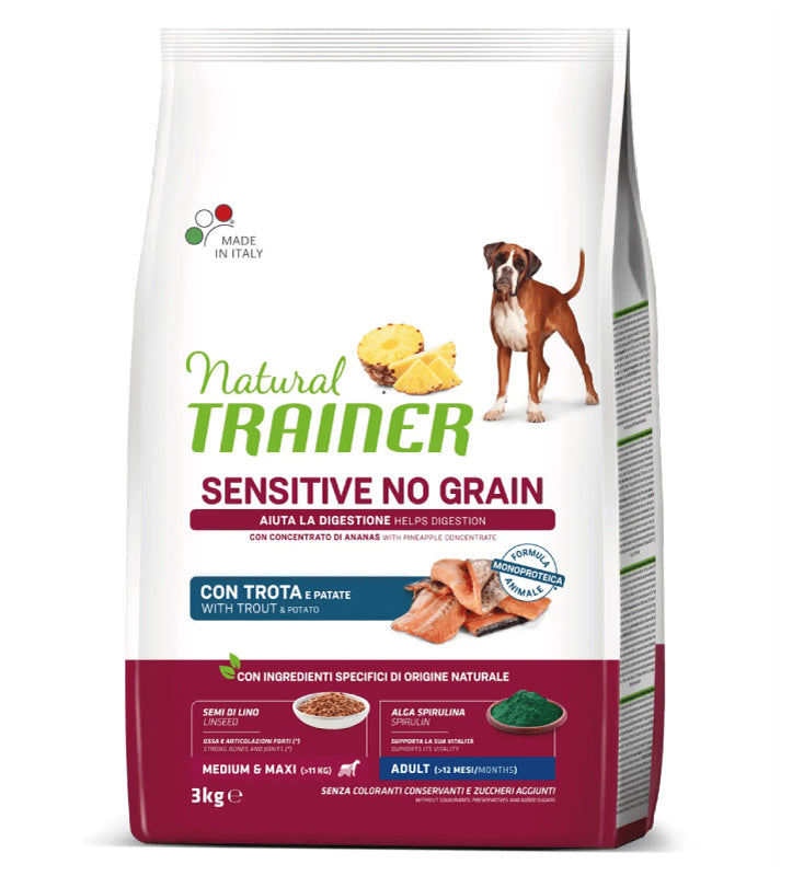 Trainer Natural Sensitive No Grain Medium/Maxi adult è un alimento completo ed equilibrato per cani adulti di taglia media e grande (oltre 11kg. di peso) con trota e patate.