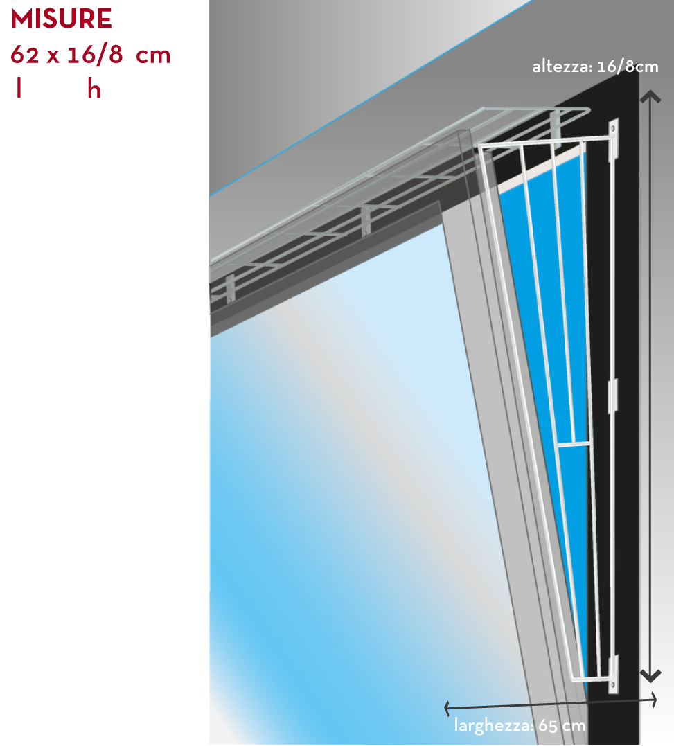 Griglia di protezione per finestre da collocare sopra o sotto, quindi adatta anche a finestre ad apertura vasistas.