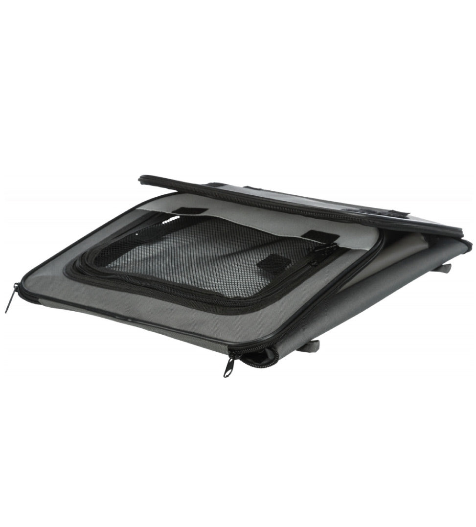 Gli inserti in rete presenti possono essere coperti. Ha tre tasche esterne per poter riporre gli accessori dell'animale. Questa misura ha un ulteriore cerniera laterale che si può aprire.