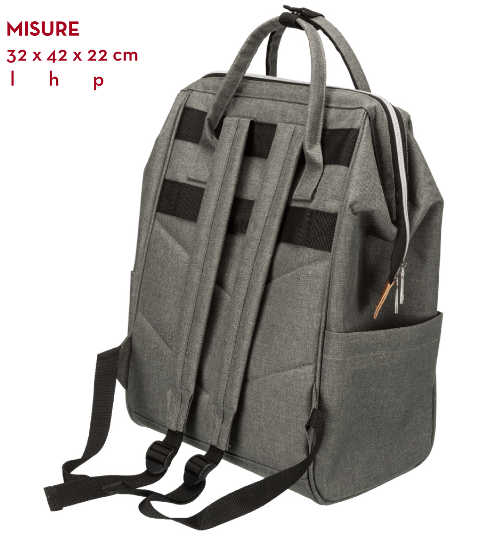 Il rinforzo in metallo garantisce la forma stabile anche quando lo zaino è aperto. Si può fissare a un trolley.
