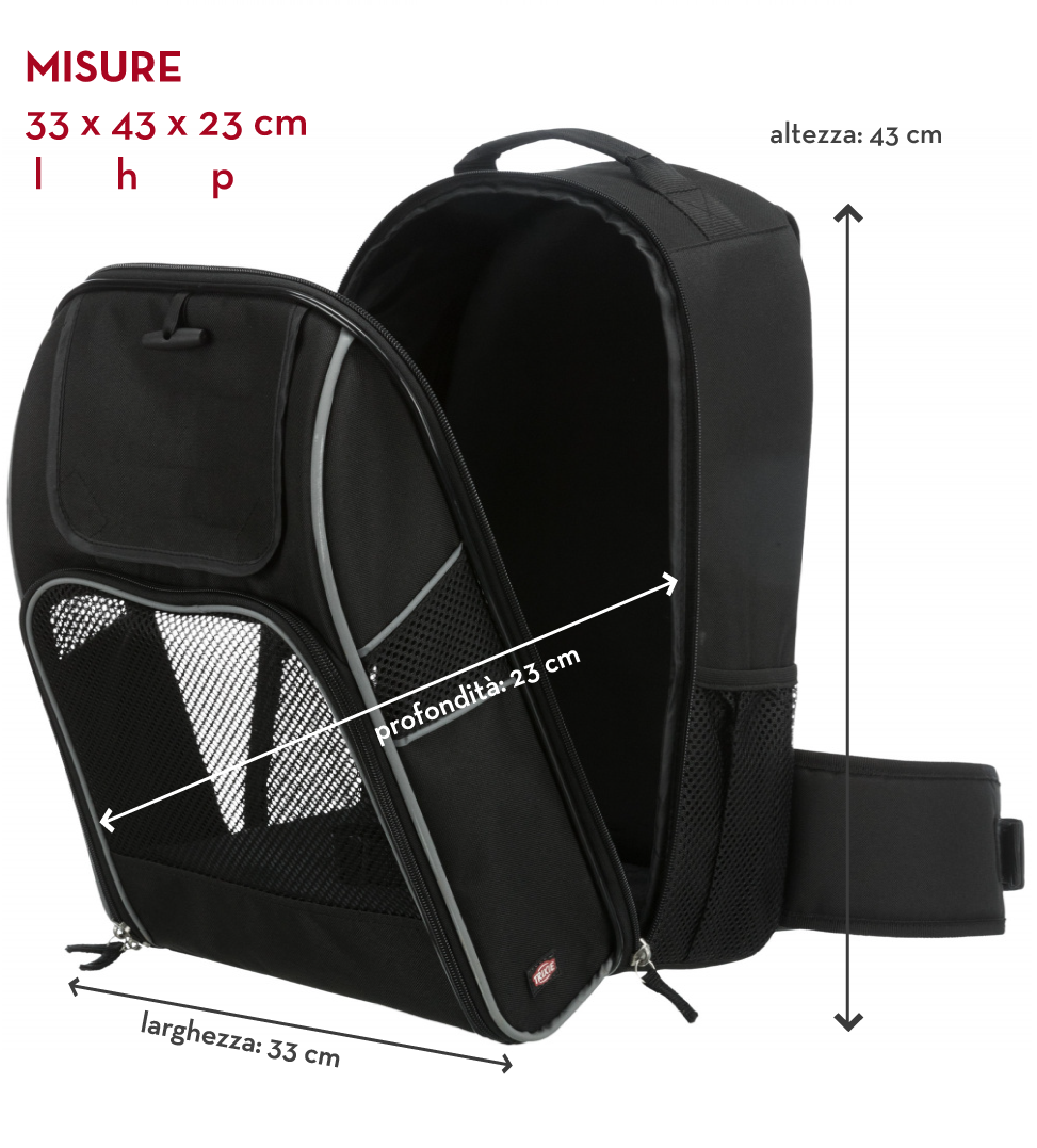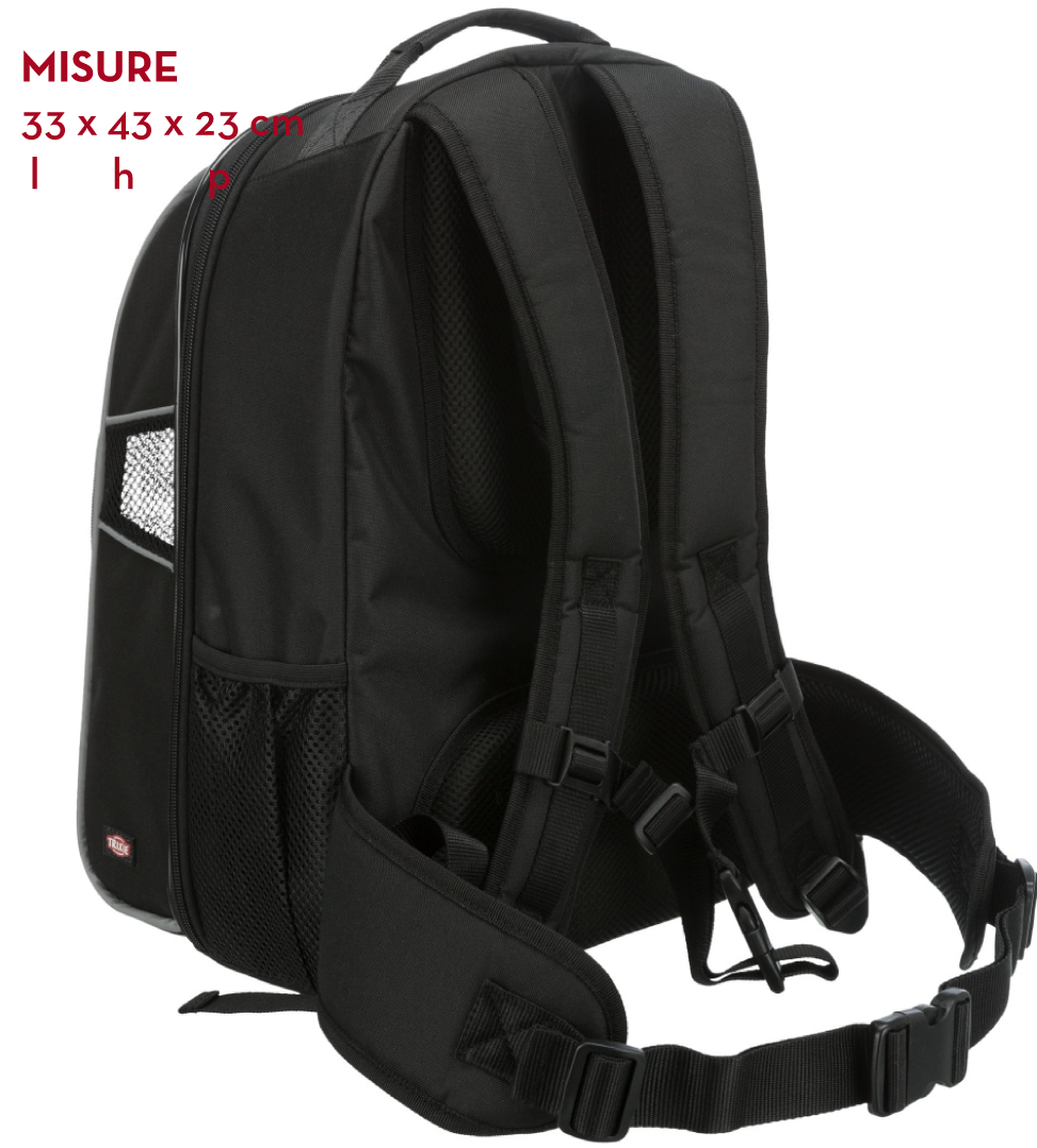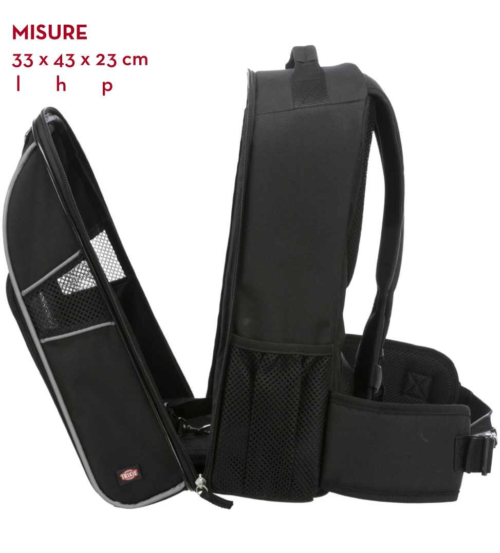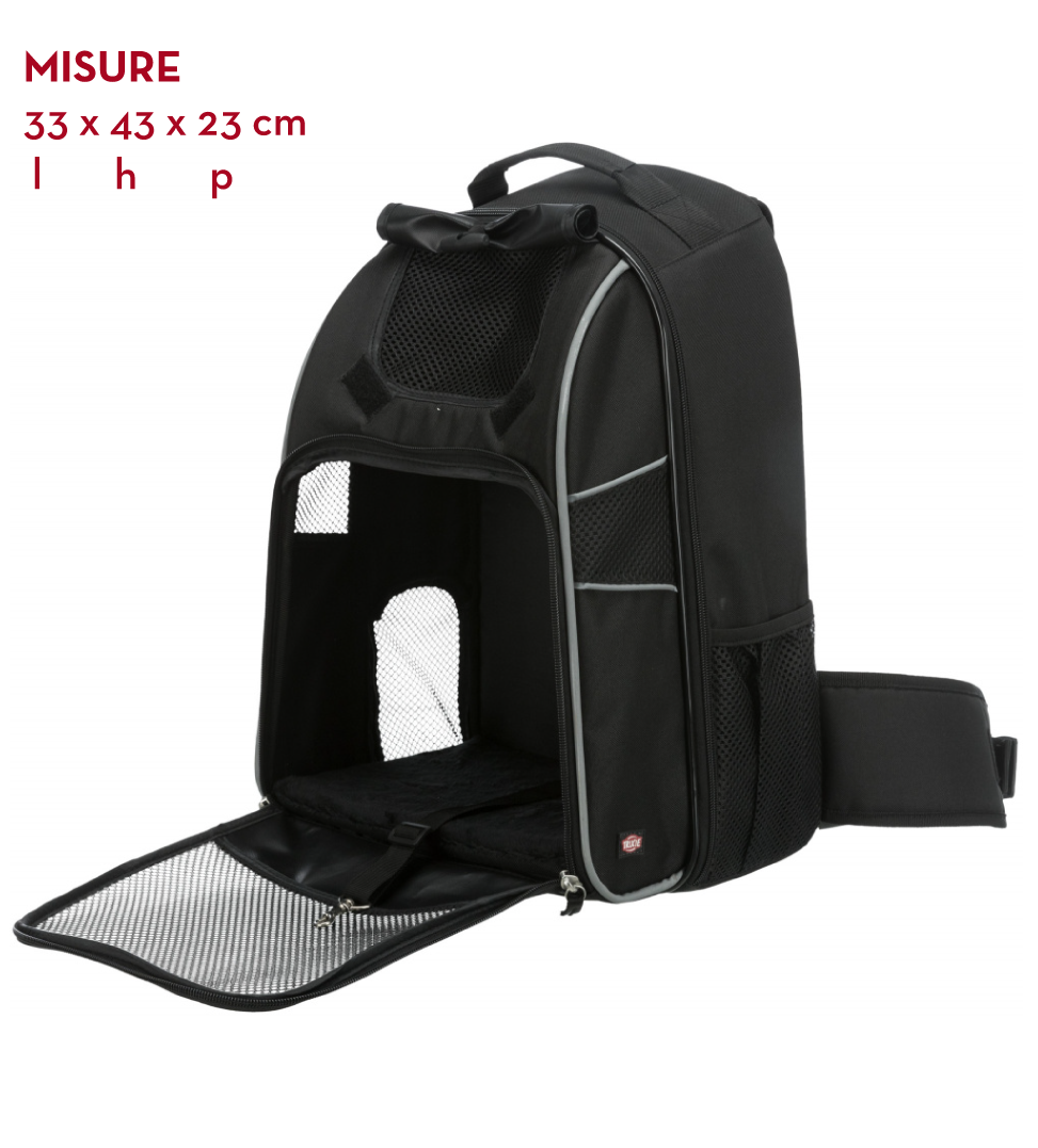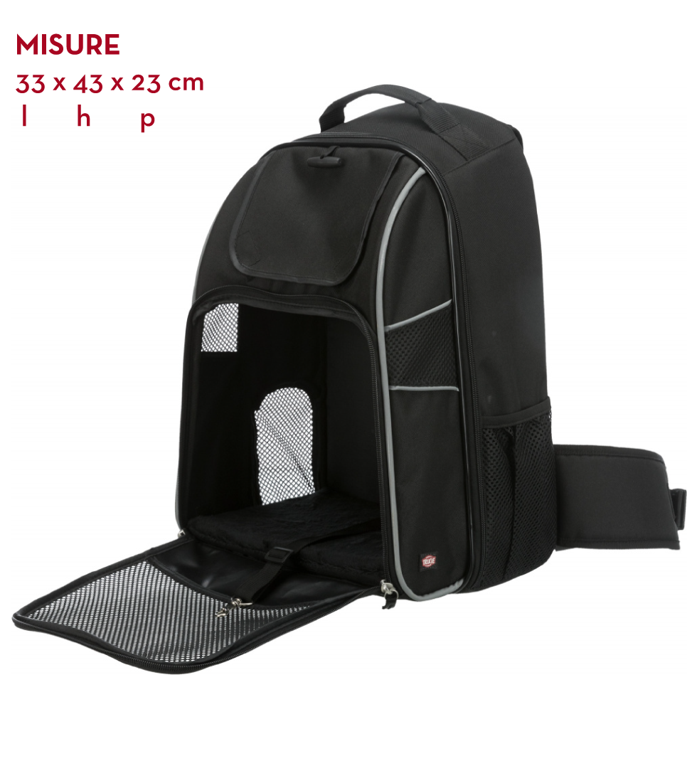 All'interno ha un corto guinzaglio per evitare che il cane salti fuori quando lo si tiene aperto e il fondo è in morbida pelliccetta sintetica (poliestere) estraibile.